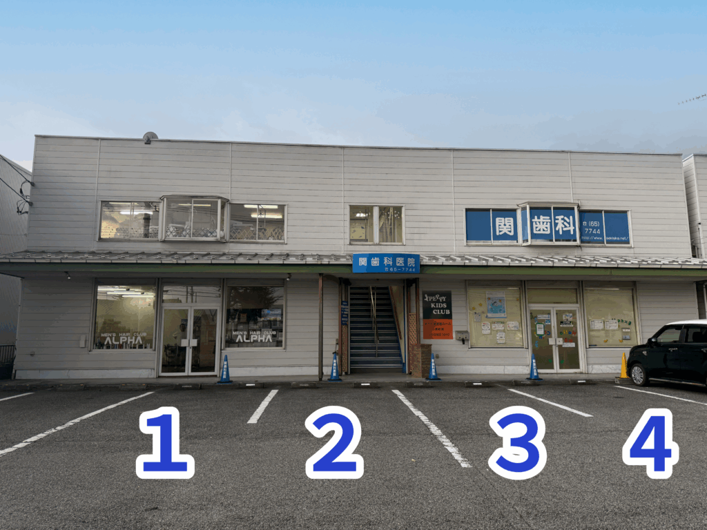 当院の建物前に専用駐車場を4台分ご用意しております。青いコーンに「関歯科医院」と記載された区画が目印です。