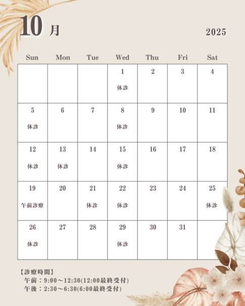| 9:00-13:00 ※受付は12:30まで  | ◯ | ◯ | 休 | ◯ | ◯ | ◯ | 休 |