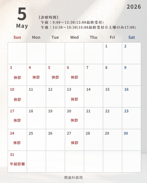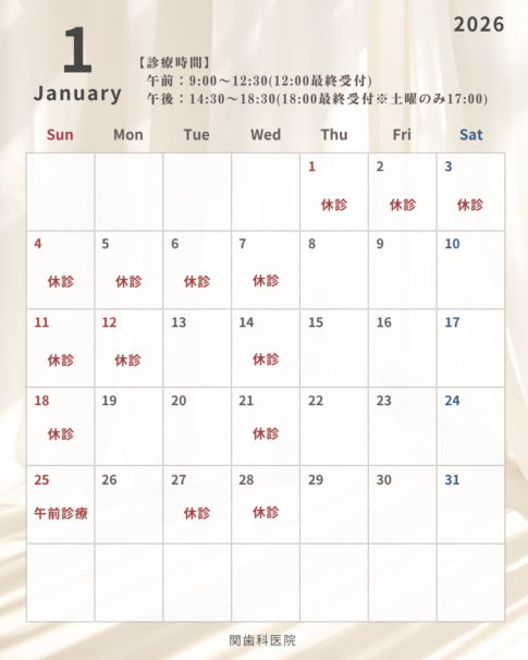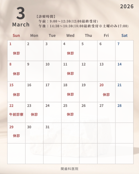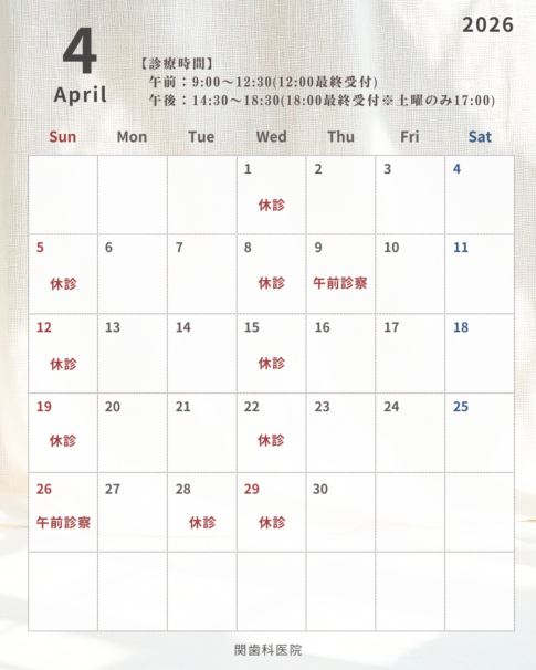 | 9:00-12:30 ※受付は12:00まで | ◯ | ◯ | 休 | ◯ | ◯ | ◯ | 休 |